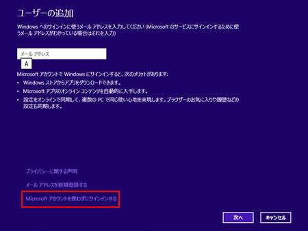 「Microsoftアカウント」では、動作しない恐れがありますのでご注意下さい。