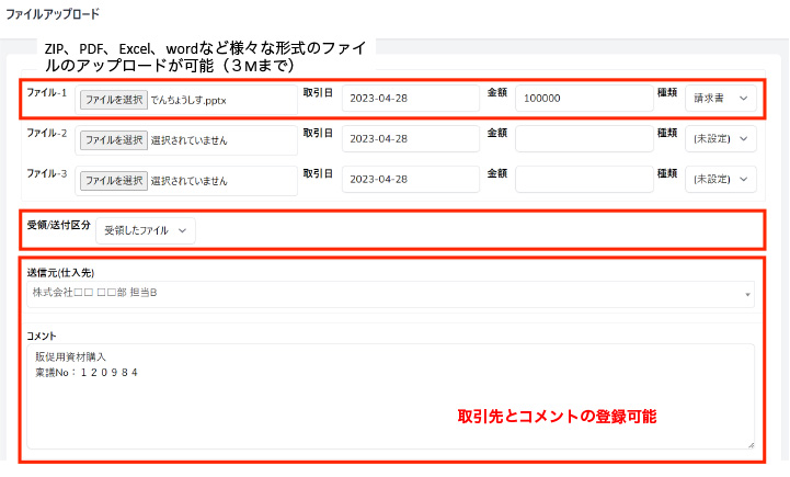 ファイルのアップロード(受取側へのメール送信を含む)機能及びファイルの受取側としての機能も有します。請求書を頂く得意先側の経理担当者等を登録します。 |