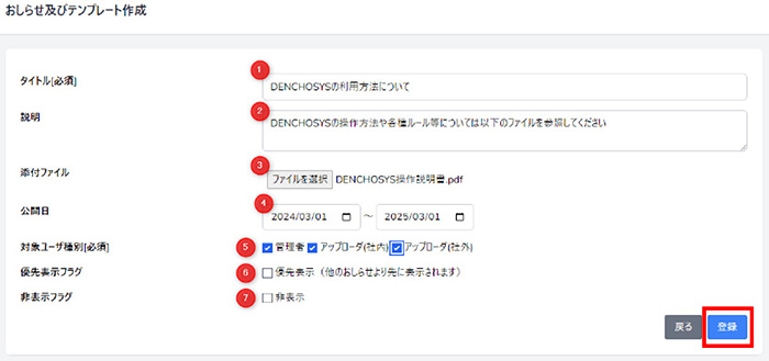 上記管理者またはアップローダーから送信されたメール記載のアドレスによりファイルをダウンロードする事ができます。請求書を発行する得意先側の経理担当者等を登録します。 |