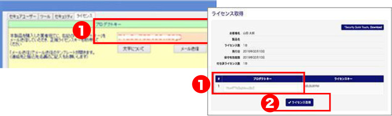 [ プロダクトキーの表示方法 ] 製品をインストール後、「ライセンス画面」に発行されます。製品の管理画面より「ライセンスタブ」へ切り替えてご確認下さい。 |